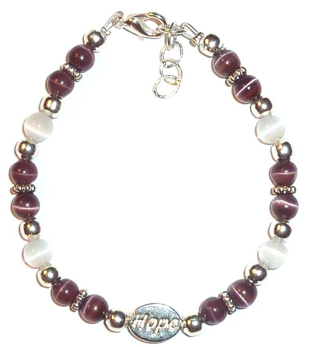 Hand-assembled in the USA, this Alzheimer's awareness bracelet is made with dark purple and white 6mm cats eye beads, silver plated 5mm round beads, 5mm Bali Daisy Spacer beads, and a Hope message bead. It features a 12mm lobster clasp and professional wire for added durability. The 7 3/4 inch length is a universal fit for most adults and includes two extension rings. Each bracelet comes mounted on a card with a meaningful quote on the back. The dark purple and white colors have significant meanings in this bracelet: dark purple symbolizes Alzheimer's awareness, while white provides a striking contrast.
