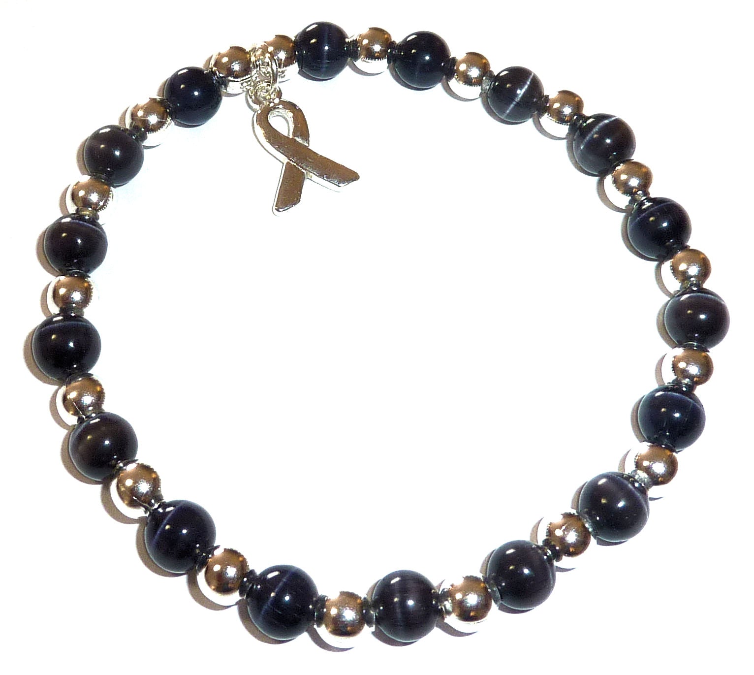 Made with 6mm cat's eye beads, silver-plated 5mm round beads, 5mm silver-plated Bali Daisy Spacer beads, and a cancer awareness ribbon. All on .80mm Stretch cord. They are assembled by hand here in the USA! These bracelets are adult-size and will fit most adults. The bracelets come mounted on a card, prepackaged with the meaning of all the cancer colors printed on the back of the card. A great way to get bracelets for any cancer awareness event, to resell for a good cause or just to wear yourself to show support for cancer awareness.
