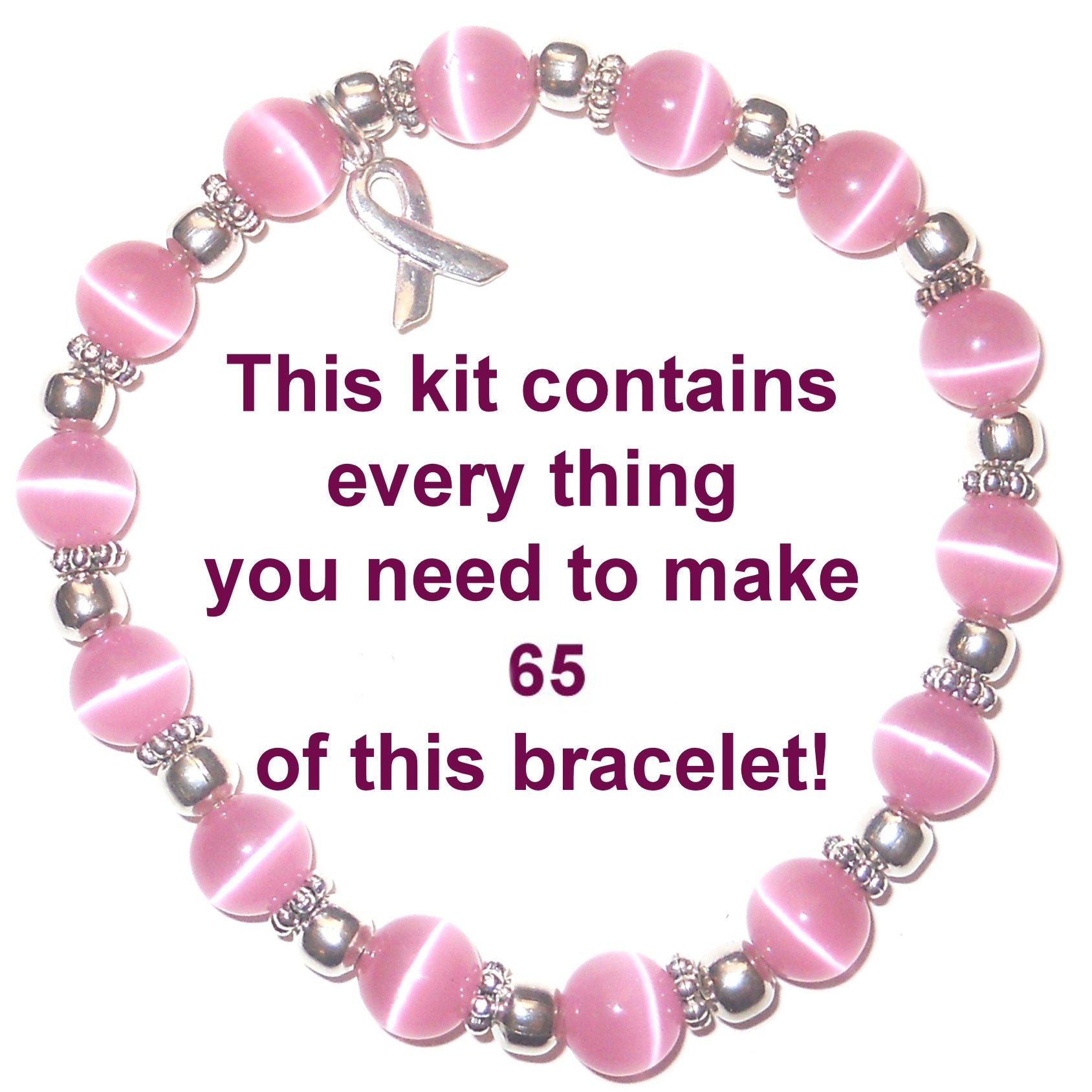 This complete kit provides everything necessary for creating 50 8mm breast cancer awareness bracelets with stretch cord. At just $1.66 per bracelet, this kit includes a photo of a finished bracelet for reference. The final size of the bracelet is approximately 7 inches and the stretch cord ensures a comfortable fit for most adult wrists. The kit contains 12 strands of 8mm pink cats eye beads, 55 silver-plated cancer awareness ribbon charms, 1000 5mm silver-plated beads, 800 5mm Bali daisy spacer beads, and 1 roll of 50' .80mm stretch cord.