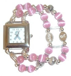 Product Description\n\nWatches (includes both band and watch face)\nthese watche bands are assembled by hand here in the USA! These watches are 7 3/4 inches long, which will fit most adults and is a good universal size (this measures the band and watch face together)\nThey are made on a stretch cord with clasps so the bands can clip on and off the watch face, but the band ist self is strechy. They feature a ribbon bead and a hope bead. \n\nMade with 8mm pink cats eye beads, silver plated 5mm round beads, 5mm silver plated Bali Daisy Spacer beads and a cancer awareness ribbon. Finished with a strong 12mm lobster clasp and strong stretch cord. They are assembled by hand here in the USA!\n\nThe watches come prepackaged with the meaning of all the cancer colors printed on the back of the card. A great way to get watches for any cancer awareness event, to resell for a good cause or just to wear your self to show support for breast cancer awareness.