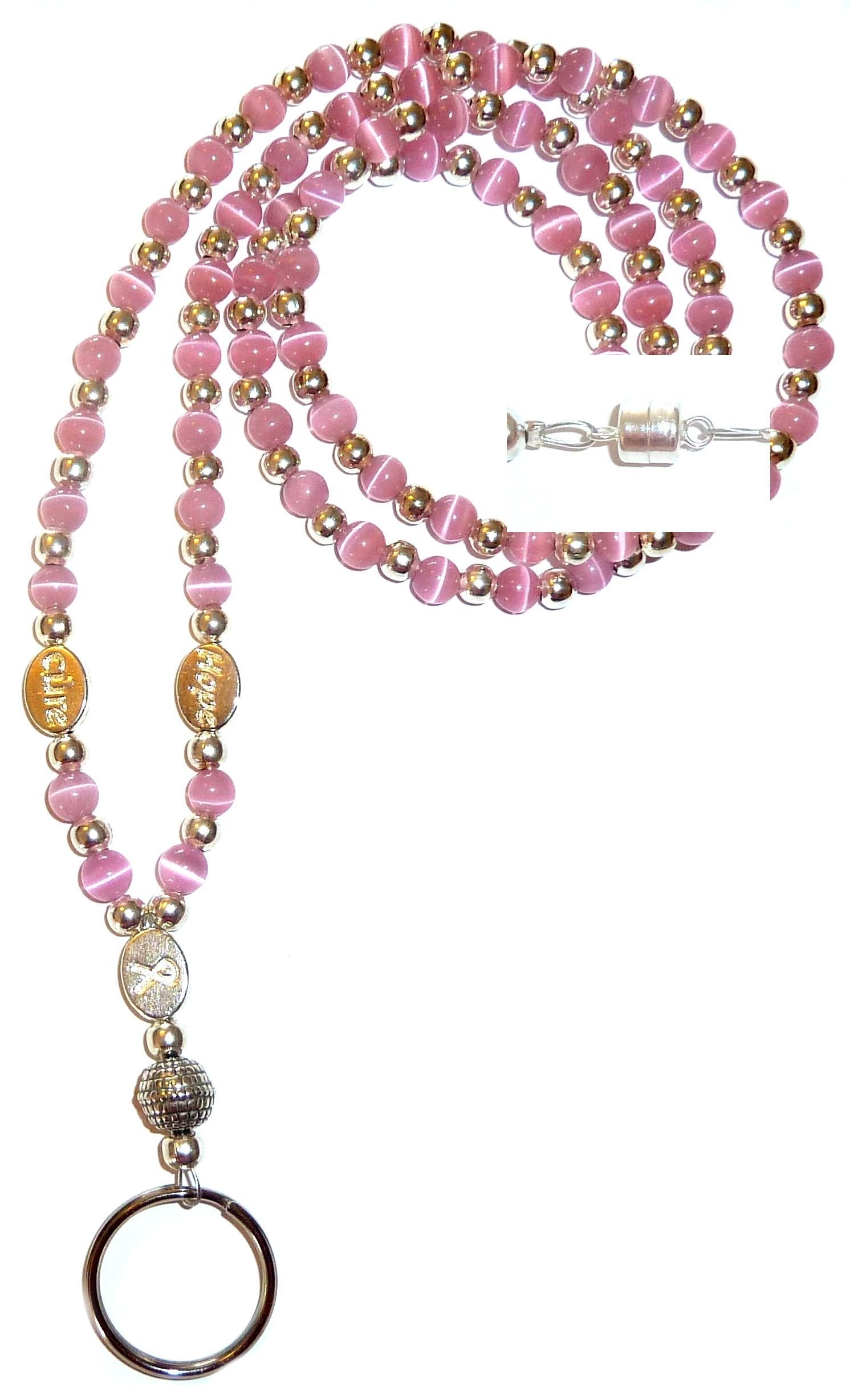 Product Description\n\nMade with Pink 6mm cats eye beads, silver plated 5mm round beads, 5mm silver plated Bali Daisy Spacer beads and a cancer awareness ribbon bead, Hope bead and Cure bead. Strung on strong proffesional wire with a strong magnetic Clasp. They are assembled by hand here in the USA!\n\nThese Lanyards are 34 inches long. A great way for proffesionals to show thier support.\n\n \n\nThe Breast Cancer Awareness Lanyard comes mounted on a card, prepackaged with the meaning of all the cancer colors printed on the back of the card. A great way to get bracelets for any cancer awareness event, to resell for a good cause or just to wear your self to show support for cancer awareness.\n\nColors used in this bracelet and their meanings: You will receive the following colors: Forest Green (Renal/Kidney), Dark Brown (Colo-rectal & Anti-Tobacco), Purple (Pancreatic), Orange (Leukemia), White Pearl(Lung), Royal Blue (Thyroid & Prostate), Mint (Liver, Lymphoma & transplant), Lavender (All cancer survivors and general cancer awareness), Yellow (Bladder & Sarcoma), Black (Melanoma), White (Cervical, Bone & Retinoblastoma), Gray (Brain), Pink (Breast), Teal (Ovarian), Peach(Uterine), Red/Burgundy (Aids/Myeloma), Golden (Childhood Cancer) & Periwinkle (Stomach).