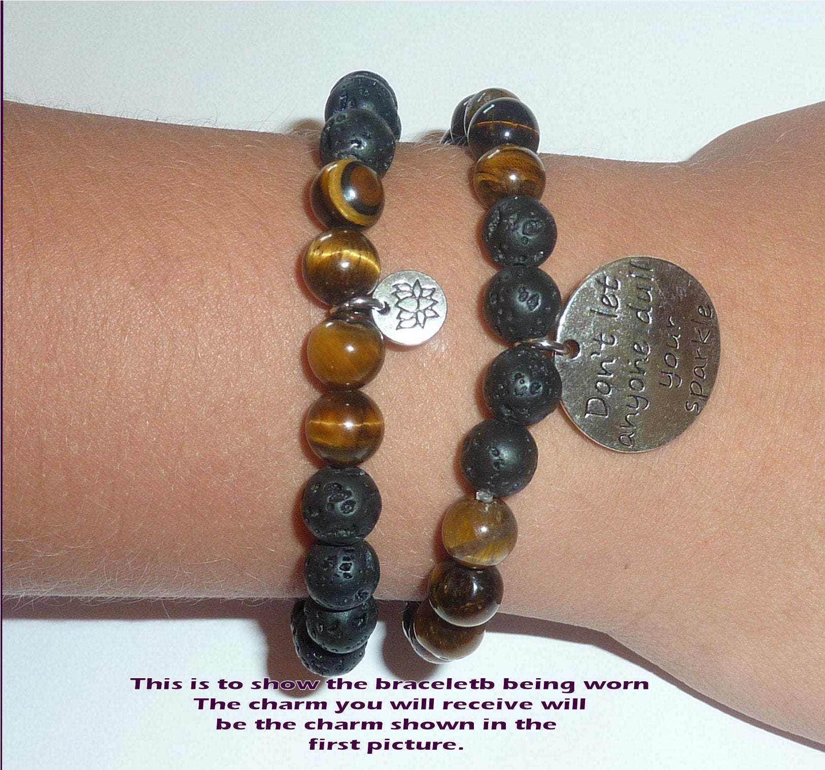 - Expertly handcrafted in the USA, these Women's Tiger Eye & Black Lava Diffuser Yoga Beads Charm Stretch Bracelets are made with durable 8mm stones and are packaged in a beautiful gift box for a touch of elegance. The Black Lava beads serve as a perfect diffuser for essential oils, while the 8mm size makes them ideal for women. Each set includes 2 bracelets, one with a Lotus charm and the other with a charm of your choice. Indulge in these exquisite bracelets that combine style with the benefits of aromatherapy and make a lasting impression.