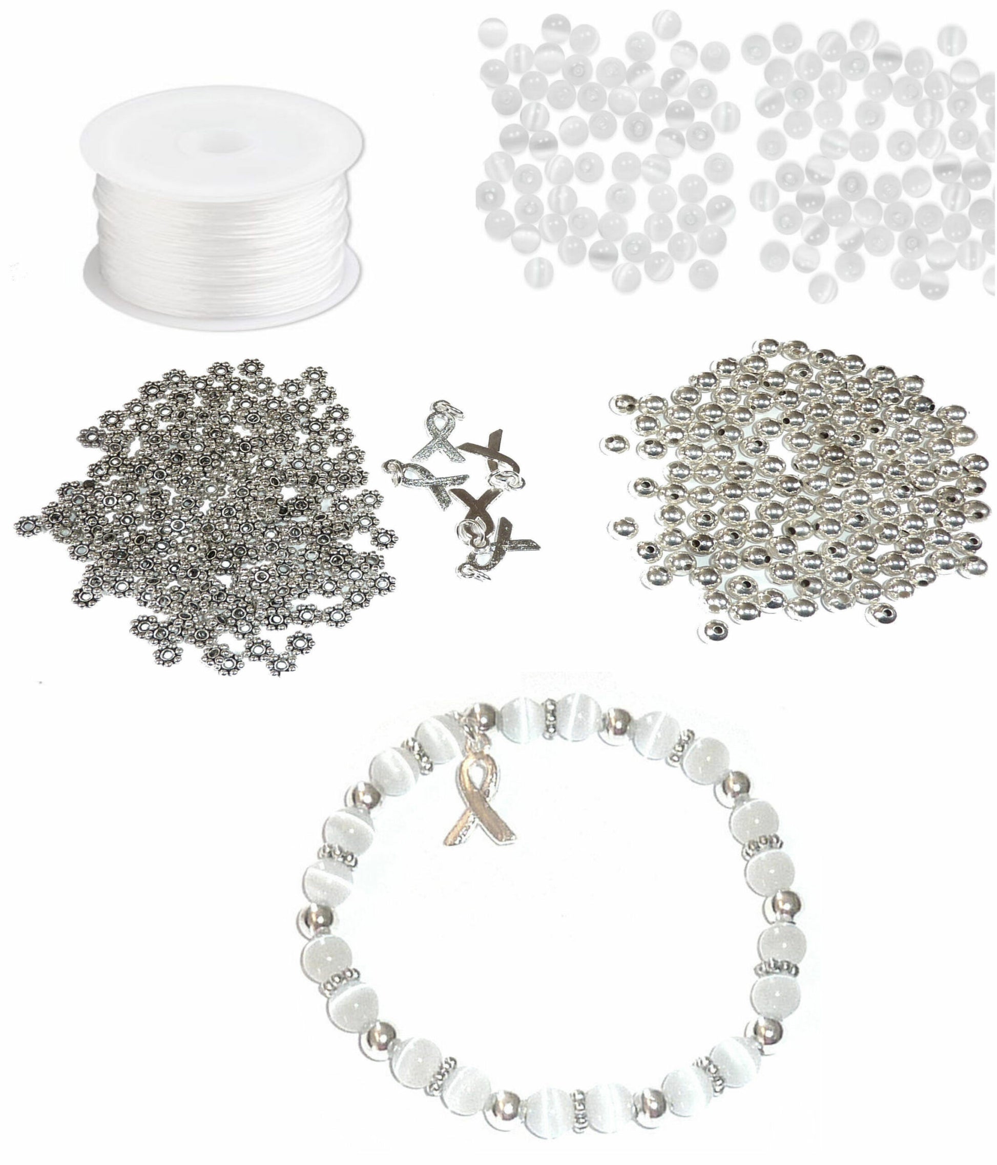 DIY Kit, Everything You Need to Make Cancer Awareness Bracelets, Uses Stretch Cord, Great for Fundraising Makes 5 - White (Cervical, Bone & Retinoblastoma)