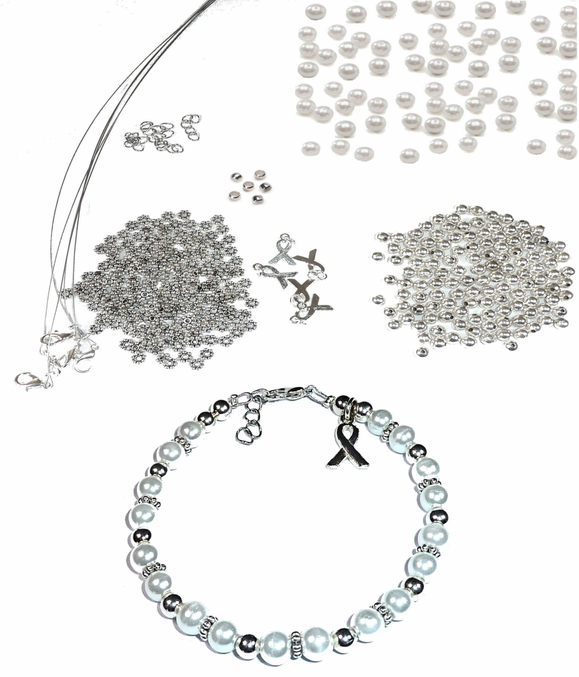 DIY Kit, Everything You Need to Make Cancer Awareness Bracelets, Uses Wire, Crimps and Clasps, Makes 5 - White Pearl (Lung Cancer)