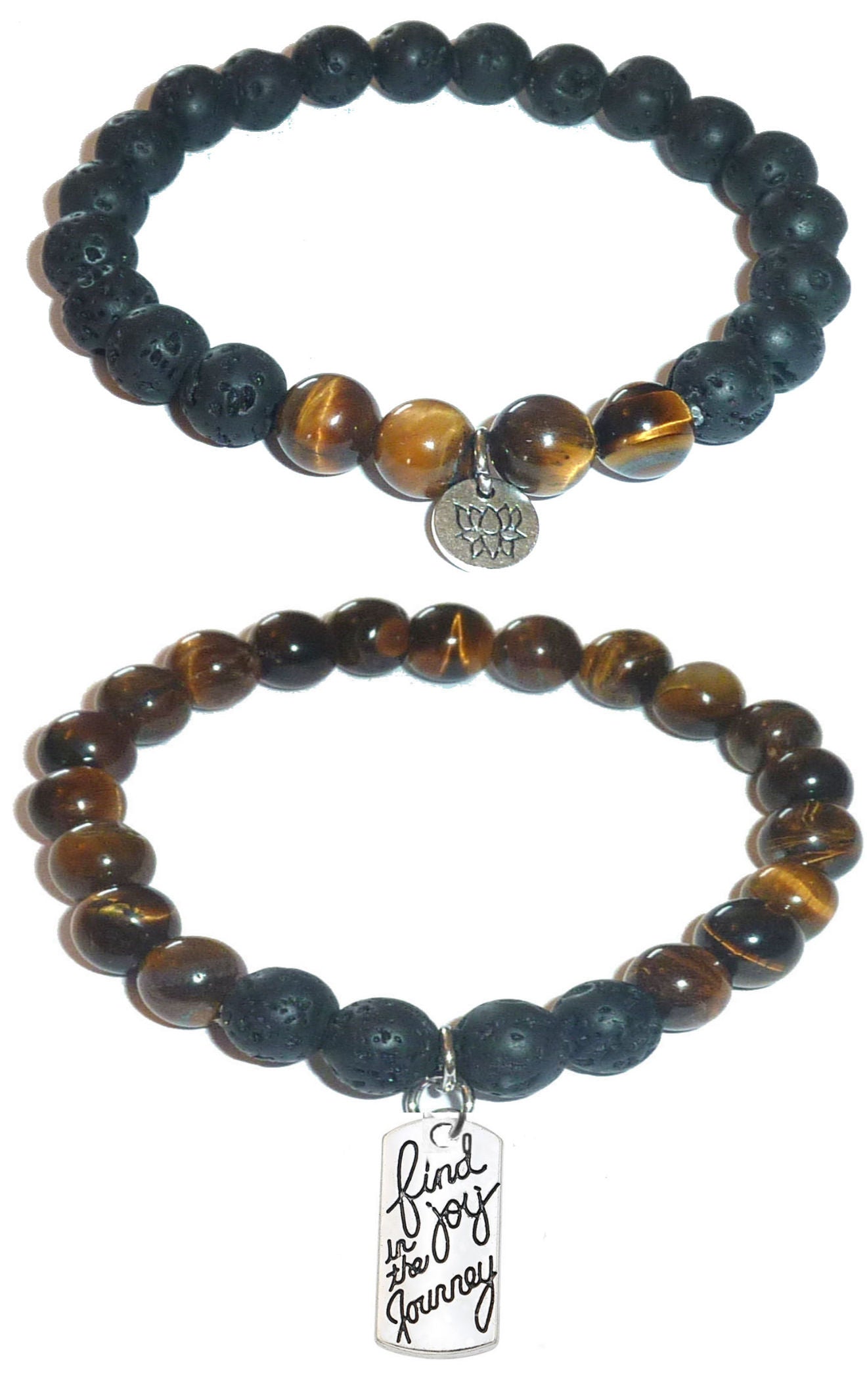 - Expertly handcrafted in the USA, these Women's Tiger Eye & Black Lava Diffuser Yoga Beads Charm Stretch Bracelets are made with durable 8mm stones and are packaged in a beautiful gift box for a touch of elegance. The Black Lava beads serve as a perfect diffuser for essential oils, while the 8mm size makes them ideal for women. Each set includes 2 bracelets, one with a Lotus charm and the other with a charm of your choice. Indulge in these exquisite bracelets that combine style with the benefits of aromatherapy and make a lasting impression.