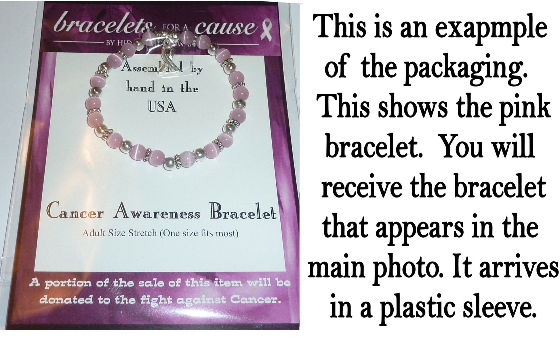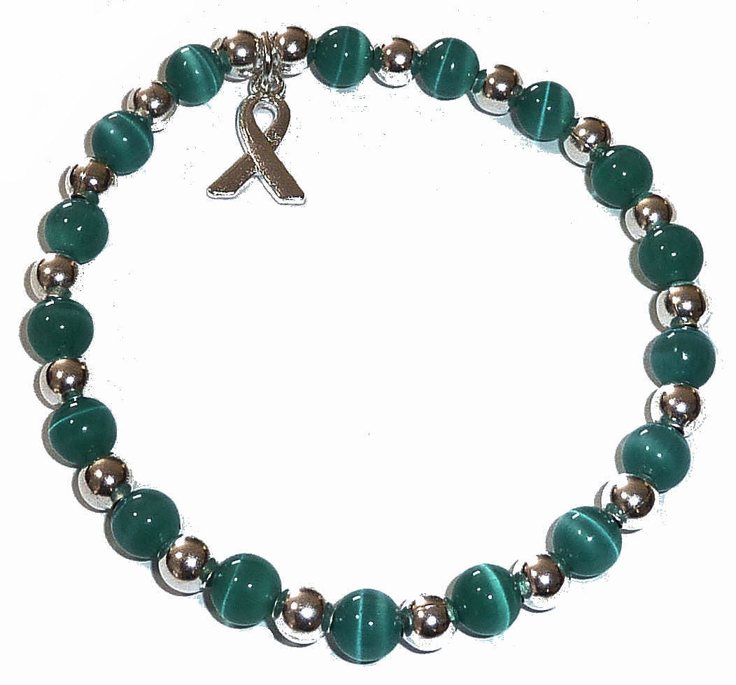 Made with 6mm cat's eye beads, silver-plated 5mm round beads, 5mm silver-plated Bali Daisy Spacer beads, and a cancer awareness ribbon. All on .80mm Stretch cord. They are assembled by hand here in the USA! These bracelets are adult-size and will fit most adults. The bracelets come mounted on a card, prepackaged with the meaning of all the cancer colors printed on the back of the card. A great way to get bracelets for any cancer awareness event, to resell for a good cause or just to wear yourself to show support for cancer awareness.