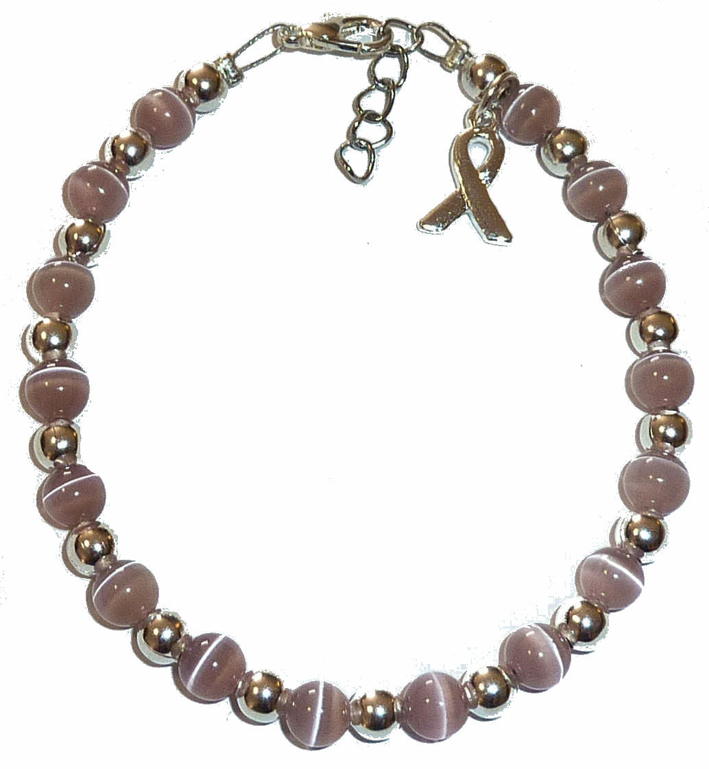 Made with 6mm cats eye beads, silver-plated 5mm round beads, 5mm silver-plated Bali Daisy Spacer beads and a cancer awareness ribbon. Finished with a strong 12mm lobster clasp and strong professional wire. They are assembled by hand here in the USA!