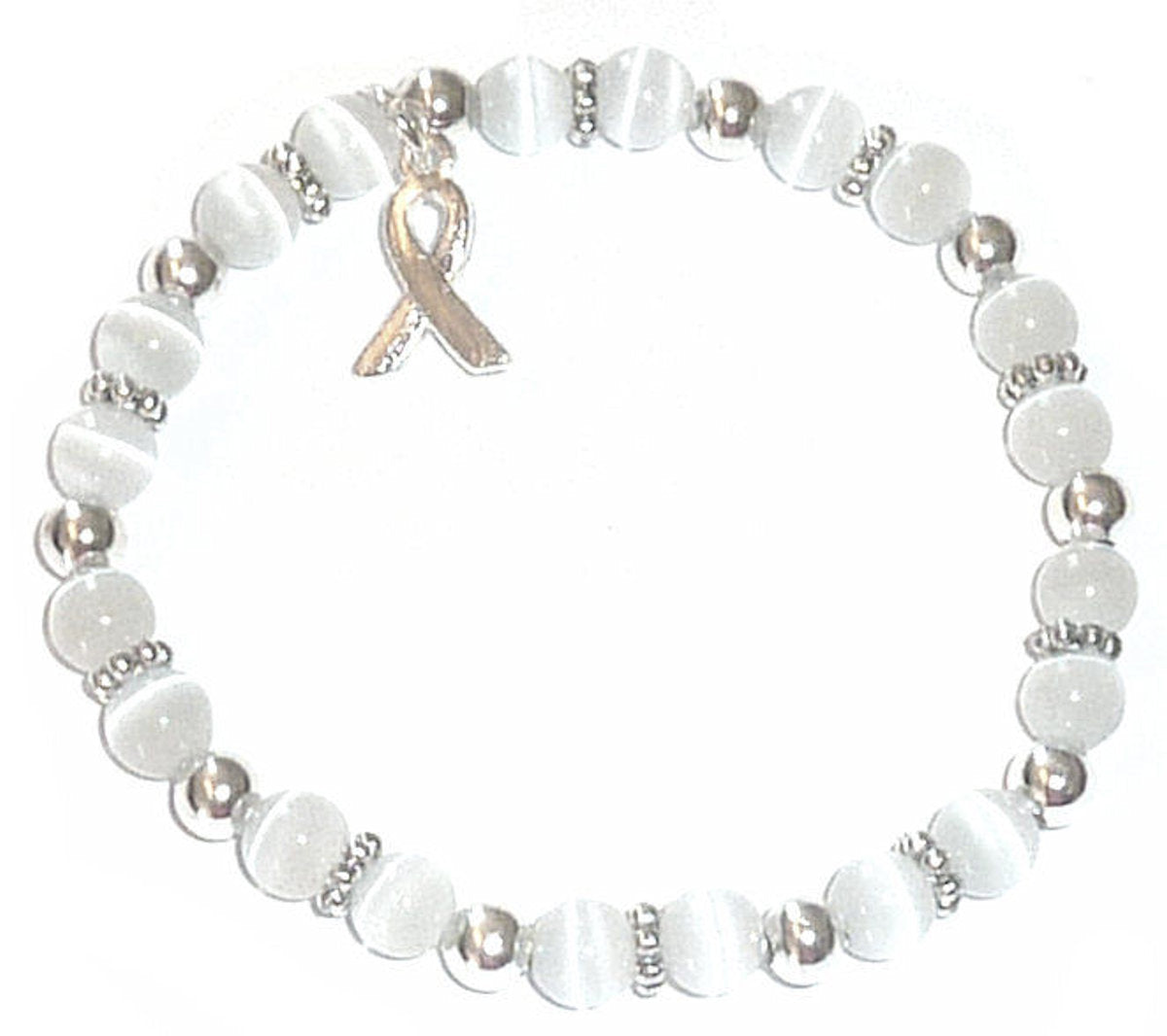 Made with 6mm cat's eye beads, silver-plated 5mm round beads, 5mm silver-plated Bali Daisy Spacer beads, and a cancer awareness ribbon. All on .80mm Stretch cord. They are assembled by hand here in the USA! These bracelets are adult-size and will fit most adults. The bracelets come mounted on a card, prepackaged with the meaning of all the cancer colors printed on the back of the card. A great way to get bracelets for any cancer awareness event, to resell for a good cause or just to wear yourself to show support for cancer awareness.